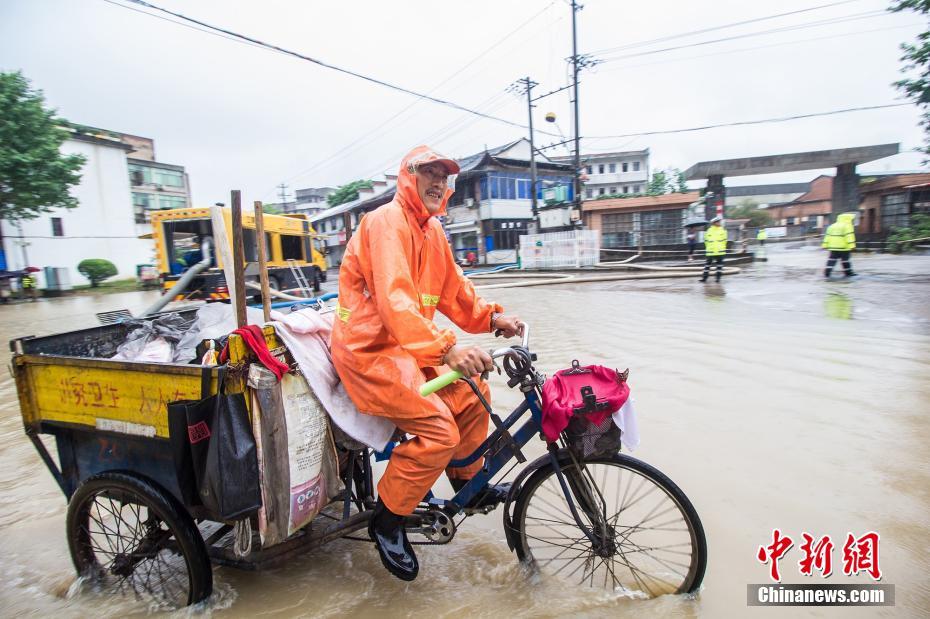 6月13日,浙江省金华市浦江县大雨倾盆,一清洁工依然坚守岗位,清运垃圾。自6月9日入梅以来,该县普降大到暴雨,截至13日16时,累计降雨量已达192.7毫米。中新社发 张浩钺 摄