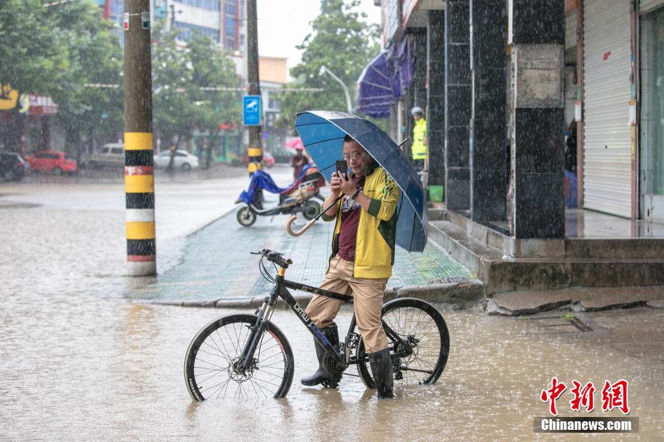 6月13日,浙江省金华市浦江县大雨倾盆,积水已经没到了人的小腿,市民依然在淡定拍照。自6月9日入梅以来,该县普降大到暴雨,截至13日16时,累计降雨量已达192.7毫米。中新社发 张浩钺 摄