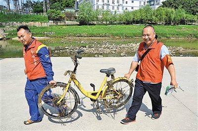 义工行动 观湖志愿者搬运捞起的落水共享单车。