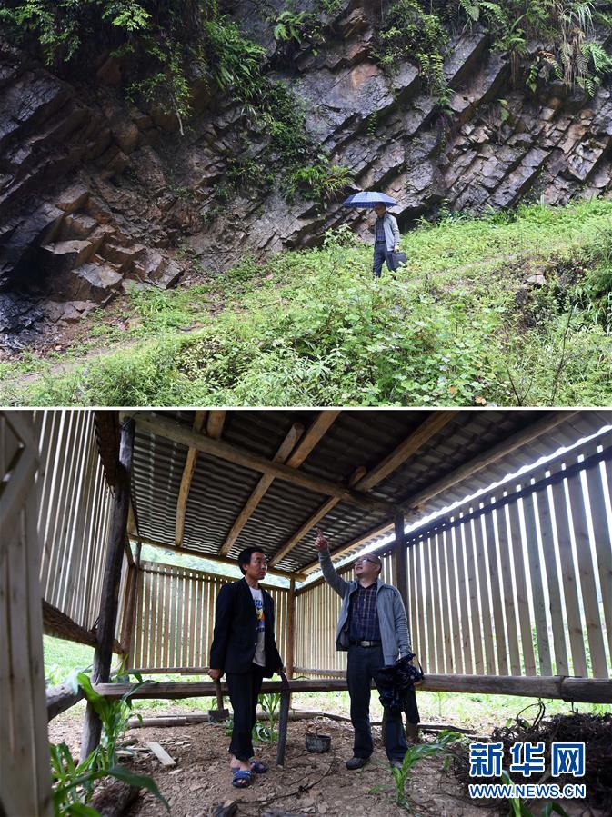拼版照片:上图为6月14日,重庆市城口县县委办干部、被选派到北坡村担任“第一书记”的庞启渊从一处绝壁上开凿的骡马道上走过;下图为6月14日,庞启渊(右)与一名村民在沟通山地鸡养殖的实施条件。