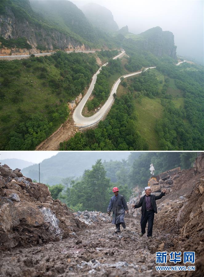 拼版照片:上图为6月14日航拍的湖北十堰郧西县坎子山村的进村公路;下图为6月14日,坎子山村村支书魏登殿(右)在查看进村公路建设情况。