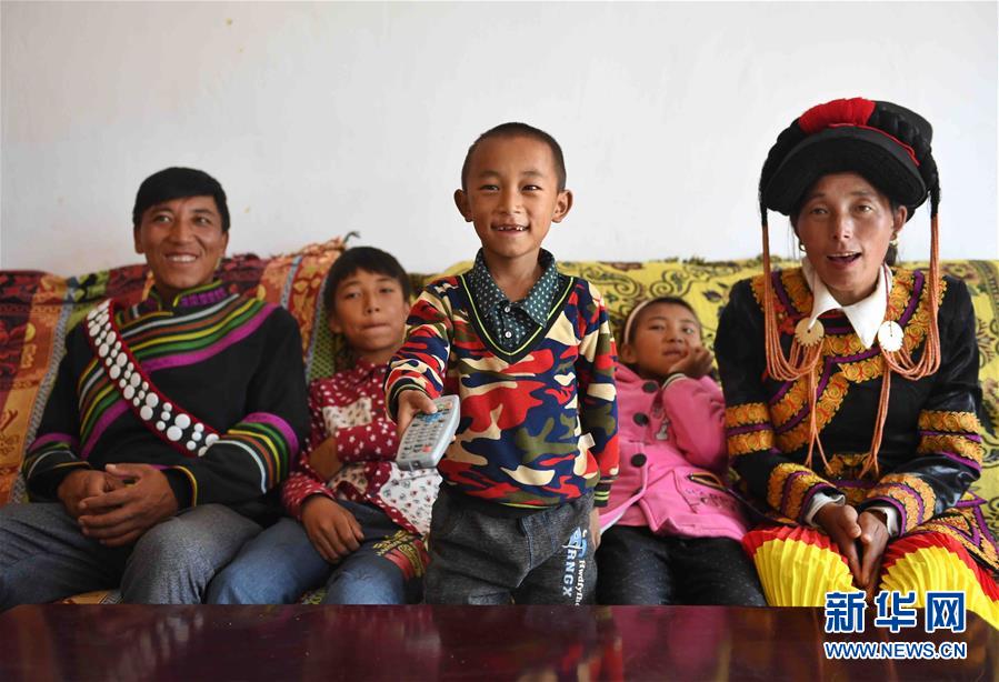 6月14日,四川凉山彝族自治州雷波县汶水镇铜厂沟村村民苏取强(左一)一家在新居内看电视。