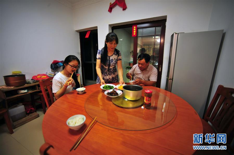 6月14日,江西省于都县罗坳镇大桥古嶂新村村民陈星宇(右)一家三口吃晚饭。陈星宇出生在罗坳镇大桥村深山里,祖祖辈辈都没搬离过土坯房。2015年2月,享受深山移民搬迁政策,陈星宇一家住进了于都县上欧工业园移民安置小区三房两厅的精装房里,有电有水有网。