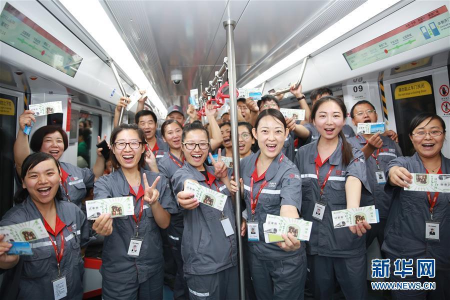 6月14日,石家庄地铁建设者在地铁车厢内合影。