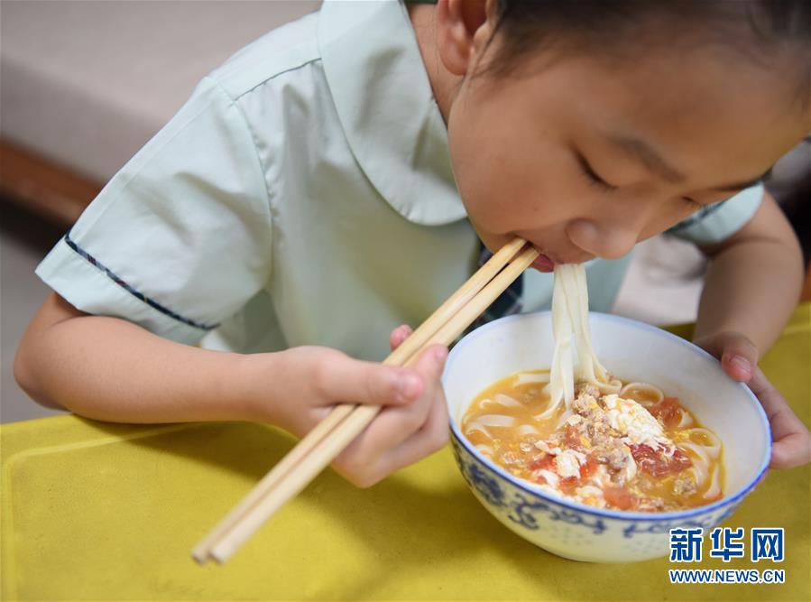 在紧挨深圳福田口岸的一小区中,文菡吃着妈妈特意做的面条,这天是她的农历生日(5月12日摄)。新华社发(王申 摄)