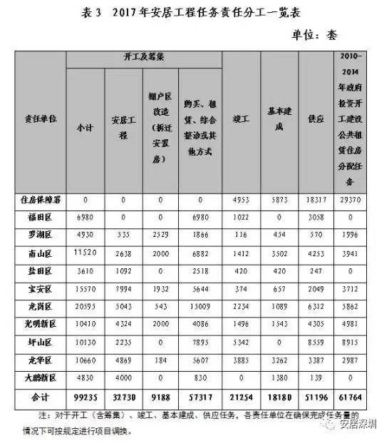 按责任单位分,福田区6980套,罗湖区4930套,南山区 11520套,盐田区3610套,宝安区15570套,龙岗区20595套,光明新区10410套,坪山区10130套,龙华区10660套,大鹏新区4830套。