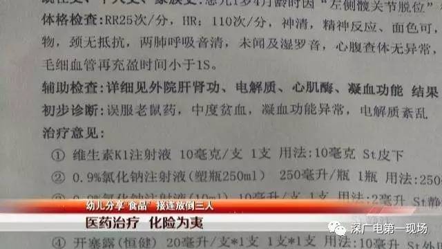 穆女士的女儿娟娟在北大深圳医院接受洗胃治疗,萱萱和圆圆则被转送到深圳市儿童医院洗胃。洗完胃以后,娟娟的血红蛋白和红细胞比积等检查项目仍不达标,随后被也被转送到儿童医院,儿童医院的诊断是误食老鼠药,中度贫血、凝血功能异常,电解质紊乱。一直忙活到凌晨两三点,孩子才恢复过来。