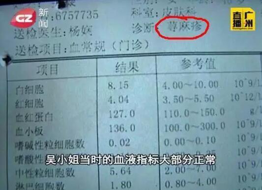 双方争执不断的时候,酒店工作人员就拿出一份,此前吴小姐在医院接受检查后的报告单。报告显示吴女士诊断结果为荨麻疹。记者翻阅资料看过,昆虫叮咬确实也会导致荨麻疹。不过报告上面显示,吴小姐当时的血液指标大部分正常。