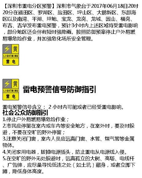 深圳市气象台于2017年06月18日20时20分在福田区、罗湖区、盐田区、坪山区、大鹏新区、东部海区以及南湾、平湖、坪地、宝龙、龙岗、龙城、园山、横岗、布吉、吉华发布雷电预警,预计3小时内上述区域将受雷电影响,部分地区还会伴有短时强降雨。