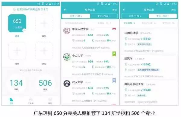 除了一款APP未收录广东省高考数据外,另外四款APP中,有一款推荐报考本科第二批院校,两款推荐本科第一批一般院校,一款甚至推荐了多所本科第一批,211工程重点院校。四款APP三个档次,这样选择报考学校,恐怕比蒙眼瞎猜的成功率高不了多少吧!