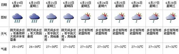 气温25-29℃;西南风2-3级;相对湿度70%-100%。