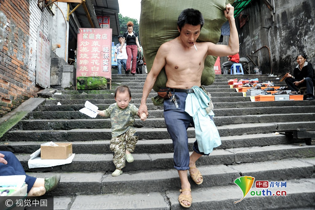 2010年6月20日,重庆市,一位棒棒军父亲肩上扛着两百多斤的货物,而另一只手紧紧牵着自己的儿子。有网友说,这位父亲,肩上扛着的是家庭,嘴上叼着的是自己,手上牵着的是未来。这位父亲名叫冉光辉,是一名重庆的“棒棒军”。他牵着的儿子,当年只有3岁。