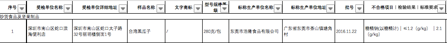 南山区蛇口滨海便利店的台湾黑瓜子,糖精钠不合格。
