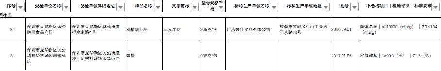 龙华区民治祥瑞华市场湘春粮油店的味精谷氨酸钠不合格。