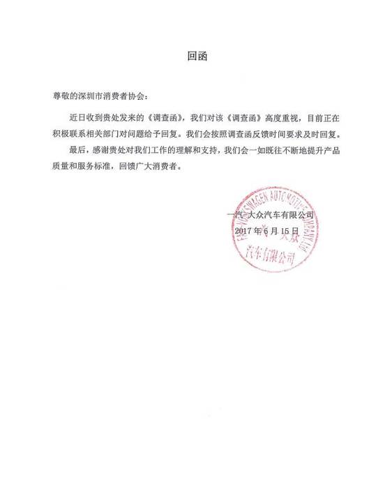深圳新闻网讯 (记者 许可馨)"深圳市消费者委员会"微信公众号发文《一汽-大众对深圳市消委会调查函作出首次回应》,全文如下: