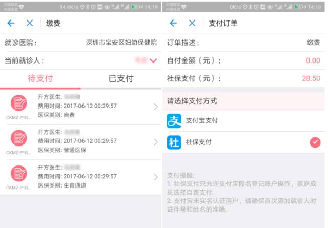 选择待支付订单(医保或自费)→ 查看费用明细 、选择支付方式