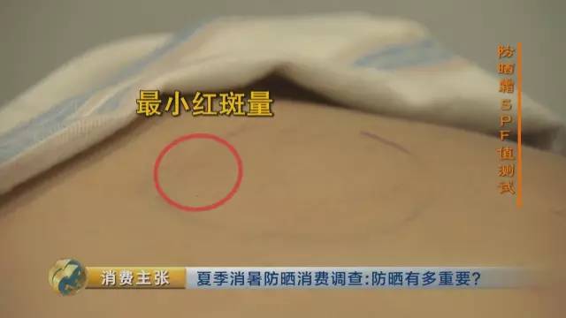 田燕中国人民解放军空军总医院皮肤科副主任医师:我们的防晒护肤品最主要目的就是涂抹上来以后,可以阻止这种红斑产生,那它阻止红斑产生强度有多大呢?我们一会儿再把这个防晒护肤品,给涂抹上了以后呢,再重复一遍这样的试验,然后等做完试验以后,我们可以看看这个孔的变化,它增加了几倍的倍数,那么增加的这个倍数呢,这个倍比之间的倍数,也就是我们防晒护肤品上面标识的SPF值的一个具体的数值。