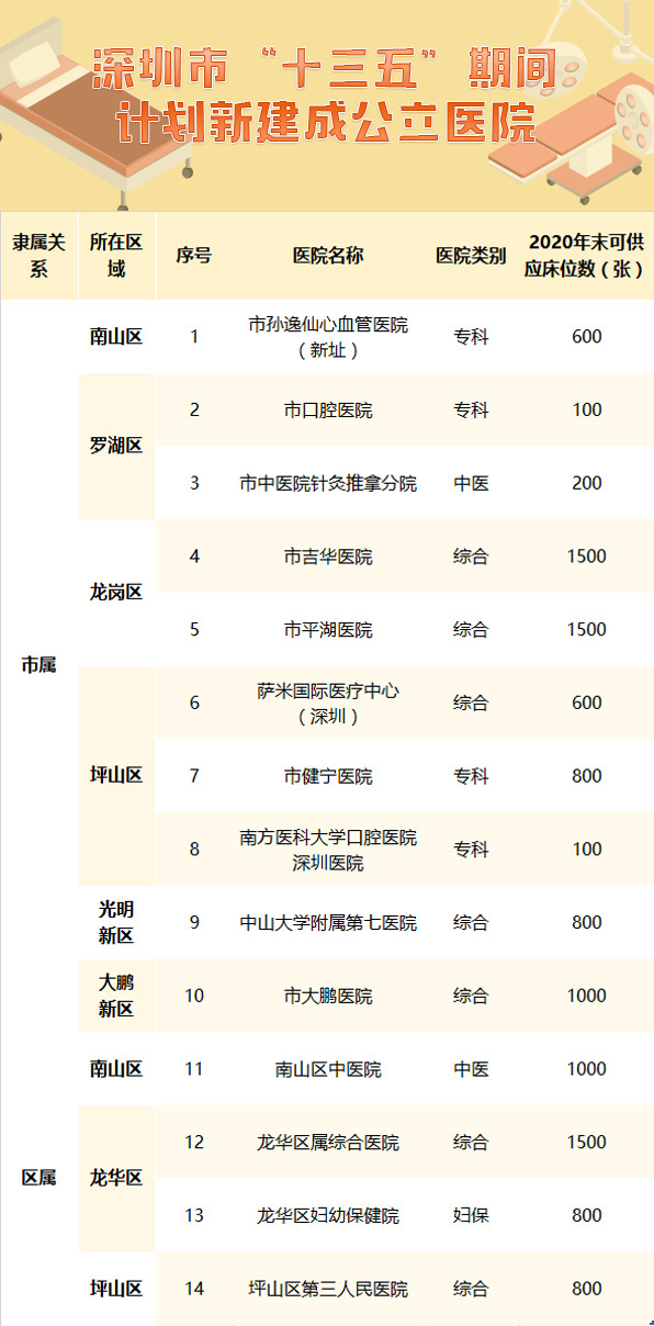 “十三五”期间,深圳将新建或改扩建60余家公立医院,其中新建成14家公立医院,使三级医院达60家以上,三甲医院达到20家;新增床位2.5万张以上,可供应床位达到6.4万张,常住人口千人床位数从2015年的3.4张增加到4.3张。