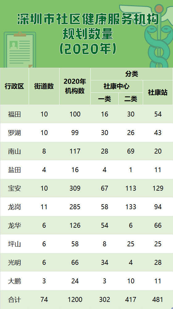 “十三五”期间,深圳将建立10家以上基层医疗集团或紧密型医联体,每个区(新区)至少1家;社康机构将从2015年的613家增加到1200家左右,其中一类社康中心302家、二类社康中心417家、社康站481家。