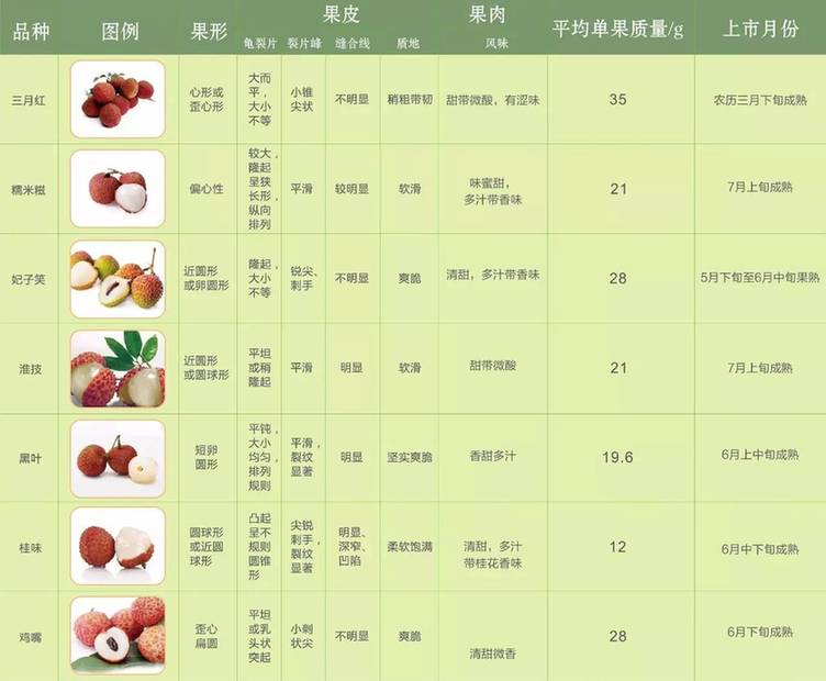 说起荔枝,人们可能只是想起那甘甜可口的透明果儿,却不曾想,在不同的月份,有不同的荔枝熟了。按照农历的月份,从3月下旬至7月上旬,三月红、妃子笑、黑叶、桂味、鸡嘴、淮技、糯米糍依次红上枝头。有的清甜,有的微酸,可根据下表进食自己喜爱的品种。