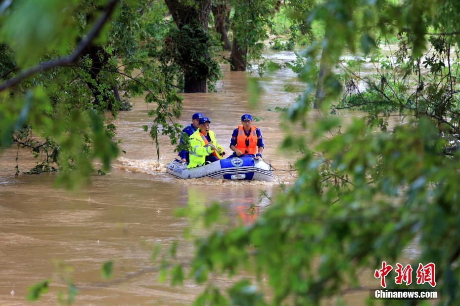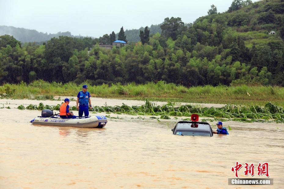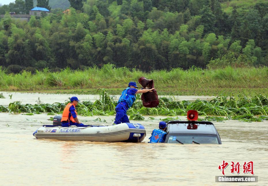 6月24日,在江西修水县,救援队在修河上搜寻失踪的3名村官。6月24日凌晨2时许,江西修水县杭口镇党委书记匡美建率5名村官乘坐皮卡车赶赴现场组织疏散民众,车辆在行驶途中被洪水冲走,当时6名乘车人员全部爬出车辆,目前已找到3名,还有三人仍下落不明。中新社发 刘家 摄