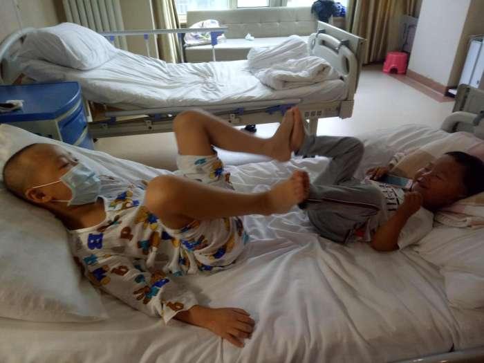 哥哥和弟弟,弟弟和哥哥,这源于血缘的亲情,在数月的彼此思念之中,相见时,他们是那么的欢乐。长期在病房卧床的赵弘逸脸上漏出了久违的笑脸,尽管他的身体非常虚弱,可是小兄弟之间玩的是那么的开心,以至赵海栋、徐金凤夫妇都不忍拉开。