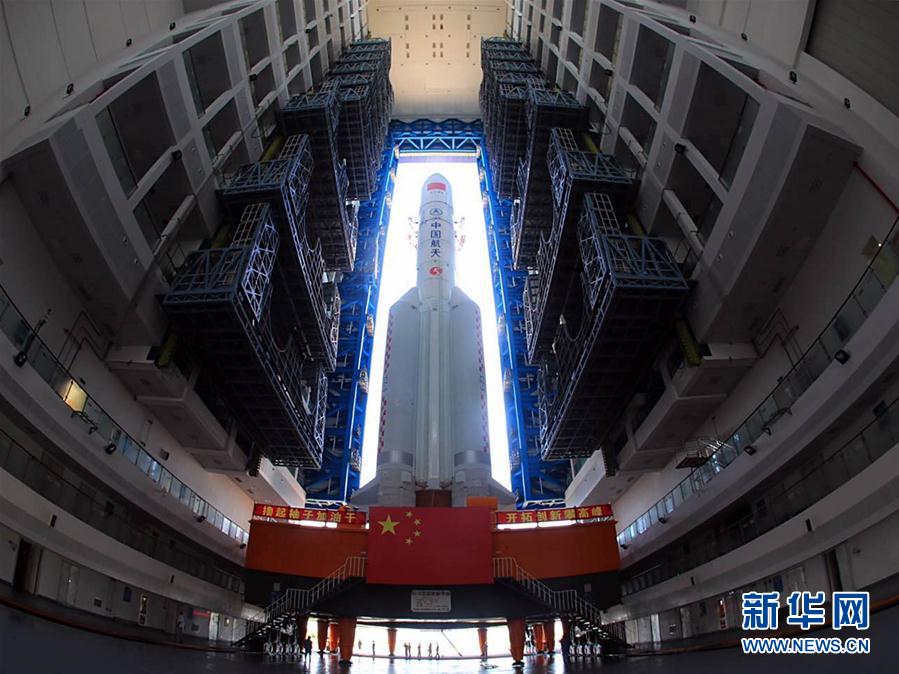 6月26日,中国长征五号遥二火箭在文昌航天发射场完成技术区相关工作后,垂直转运至发射区,计划于7月2日至7月5日择机发射。图为当日在海南文昌航天发射场拍摄的长征五号遥二火箭。新华社发(张文军摄)