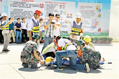 “1楼B区首层外脚手架上有木方掉下来砸到人。请指示!请指示!”接到通知后,救护组、安全保卫组、疏散组、通讯组迅速就位,开展应急救援。现场看到,安全保卫组迅速拉好警戒线维护现场,做好现场保护工作;救护组分秒必争为伤员检查并包扎伤口,随后将伤者送往医院做进一步治疗.....记者了解到,除了物体打击应急救援演练,本次活动还针对失火安全事故进行应急救援演练。两场演练现场组织得力、行动迅速,均达到了预期效果。
