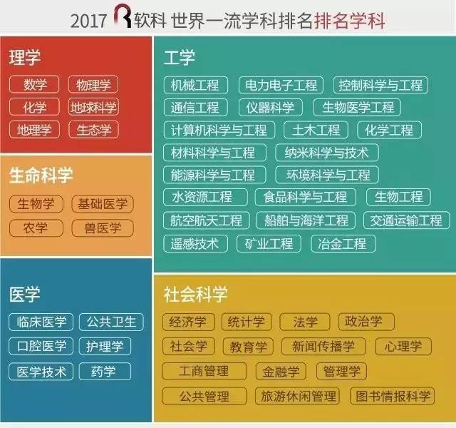 2017软科世界一流学科排名正式发布,其排名覆盖52个学科,涉及理学、工学、生命科学、医学和社会科学五大领域。