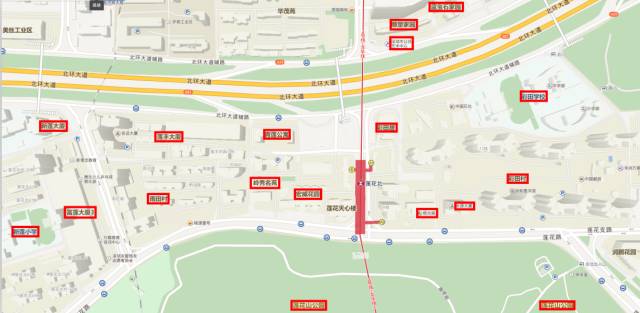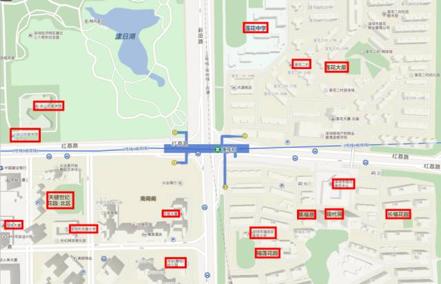 B口:福莲花园 莲花小学 深圳市现代演艺中心 长福花园 集福居 现代苑 B 口: 华强职业技术学校 黄埔学校中学部 莲花体育中心 天健名苑 香蜜三村 B 口: 青莲公寓 岭秀名苑 雨田村 富莲大厦 莲丰大厦 新莲小学 莲花派出所