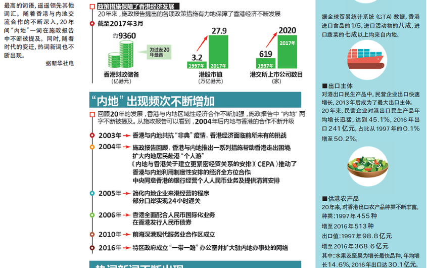 经过分析发现,总体上说,“发展”和“经济”是行政长官施政报告中出现频率最高的词语,遥遥领先其他词汇。随着香港与内地交流合作的不断深入,20年间“内地”一词在施政报告中不断被提及。同时,随着时代的变迁,热词新词也不断出现。