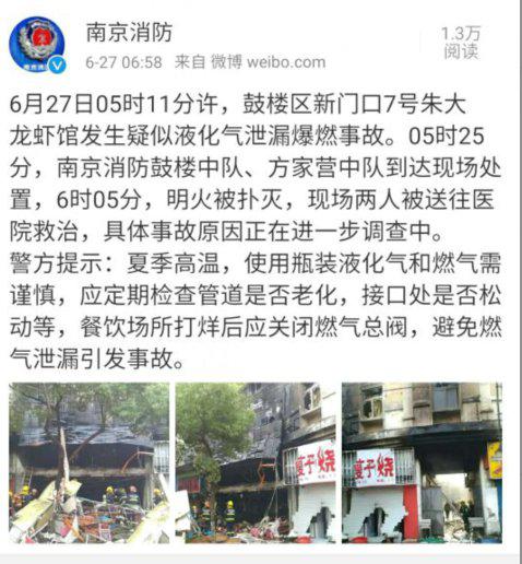 6 月 27 日早晨 5 点,在鼓楼区三牌楼新门口 2 号,一家名为盱眙朱大龙虾的饭店突发爆炸,疑似煤气泄漏引发,并随后起火,初步了解有两人受伤。