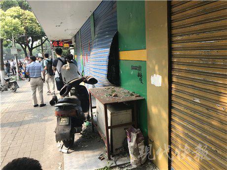 现代快报记者赶到现场看到,事发饭店两层门面玻璃全部炸光,马路上堆满炸出来的门头招贴已经灯管部件,还有大量饭店用品。旁边的三四家门面均有损坏。马路对面停着四五辆汽车均受损,有的车两面玻璃都炸碎了。