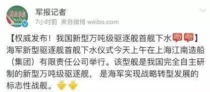 “我国新型万吨级驱逐舰首舰下水!”今天(6月28日)上午9时许,@解放军报第一时间的权威发布令广大网友“沸腾”了。