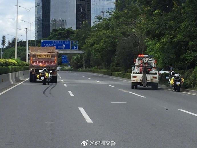 深圳交警微博全文:6月28日上午,深圳南山交警铁骑在沙河西路巡逻时发现这起交通事故,事故由泥头车变道引发!看看事故现场,有没有一种触目惊心的感觉?图为事故现场。