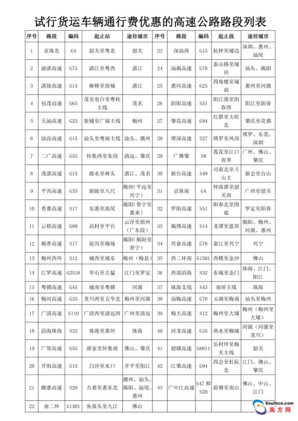 根据安排,从7月1日零时起(以高速公路出口时间为准),在保持现行货运车辆计重收费基本费率及计费规则不变的前提下,省内43条高速公路试行货车通行费八五折优惠措施。其中属于广东省交通集团的高速公路有二广、京珠北、江罗、潮惠、平兴等40个路段,属于广东省南粤交通公司的韶赣等3个路段。