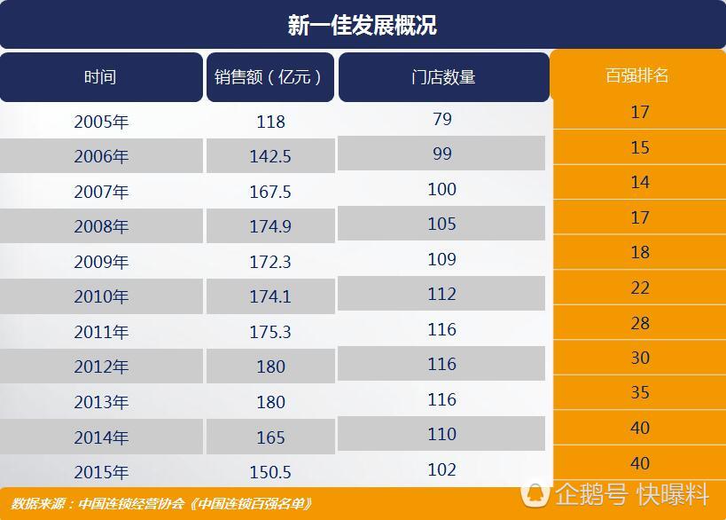 新一佳扩展有多快?快曝料根据中国连锁经营协会发布的《中国连锁百强榜》数据发现,新一佳年销售额在2012年达到180亿元,百强榜排在第30名,随后排名一路下滑,2016年已经跌出百强名单!