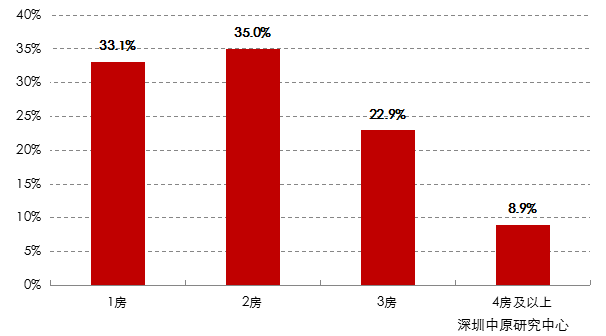 香港人最爱两房户型,在上半年港籍在深置业成交数据中,两房数量占比35%,其次是一房户型,成交占比33%。三房户型稍少,占比22%;四房最少,仅占8%。