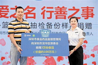 市食品药品监管局向龙华区慈善会捐出价值约100万元的食品。