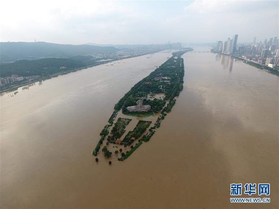 被洪水淹没的长沙橘子洲核心景区(7月2日摄)。7月2日下午,湖南省水文水资源勘测局发布洪水红色预警:受强降雨影响,湘江全线继续上涨,预计未来三天内,湘江干流全线将出现接近和超过历史最高水位的洪水。新华社记者龙弘涛 摄