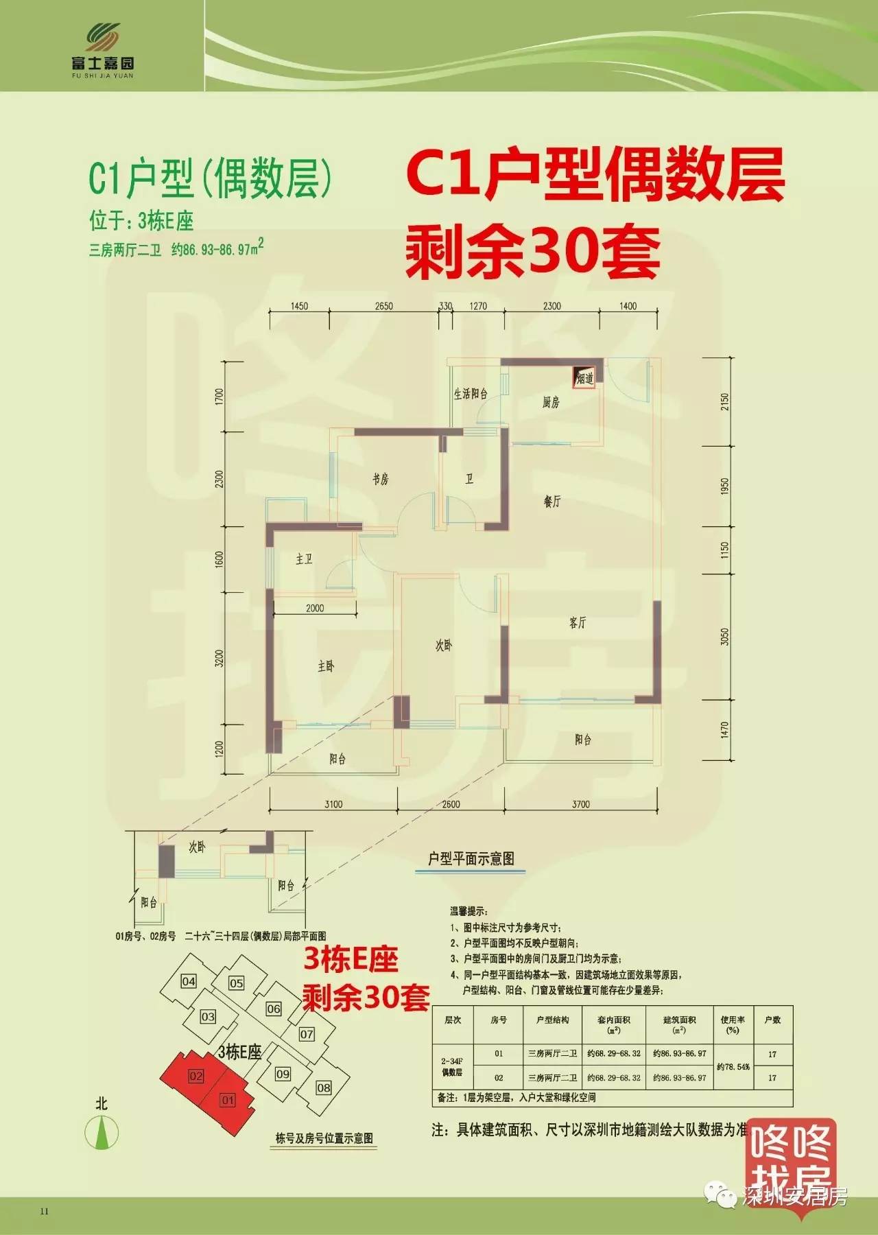 C1户型(偶数层)为三房两厅两卫,86平米左右,共剩余30套,位于3栋E座。