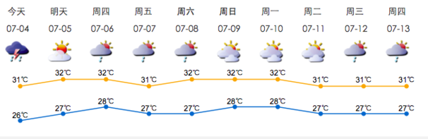 多云,有阵雨或雷阵雨,部分时间雨势较大;气温26℃~31℃;南风2~3级;相对湿度75%~100%。