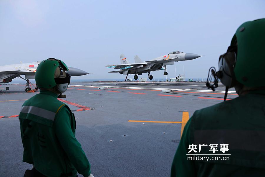 歼-15舰载战斗机在辽宁舰阻拦着舰。 李唐摄