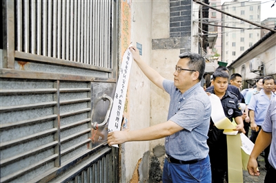 ▲7月3日下午,龙华街道党工委副书记、办事处副主任曾文峰对狮头岭旧村空屋贴上封条。