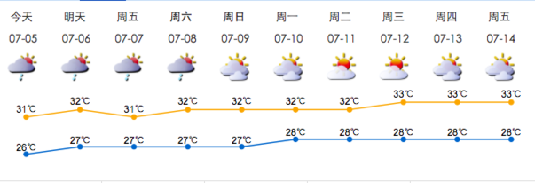 多云,有分散阵雨;气温26-31℃;东南风2-3级;相对湿度70%-95%