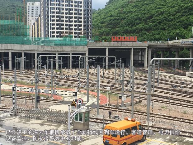 深云车辆段位于南山区龙珠大道以北,南坪快速路东侧的塘朗山公园内,有“NOCC--深圳市轨道交通网络运营控制中心”,它承载了全轨道线网列车运行、客运管理、电力供给、设备监控、防灾报警等中心职能。