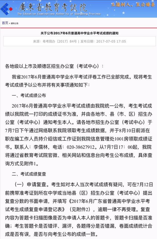 深圳新闻网7月5日讯(记者 余俐洁) 记者从省教育考试院了解到,2017年6月普通高中学业水平考试(以下简称学考)成绩将于7月7日公布,考生可在下午5点通过省教育考试院官微、相关网站和信息台查询学考成绩。