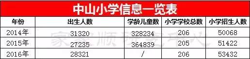 根据中山市教育局公布的数据显示,2016年小学学校总数206所,实际招生人数53432人,初中学校总数83所,实际招生人数37043人。