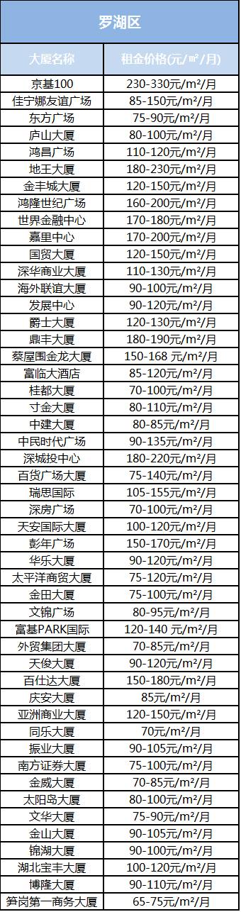 罗湖区作为传统老区,租金两极分化比较大,如京基100的租金和福田中心区租金是一样的。罗湖的乙级写字楼相对较多,普遍租金在150元/平米/月以下,比较合适中小型的贸易公司、物流公司、初创成长期的公司,毕竟成本相对低些。