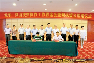 在当天下午召开的龙华-凤山扶贫协作帮扶联席会暨帮扶资金捐赠仪式上,凤山县委书记廖锦成,县委副书记、县长陆嵘与余新国、陈清一行共商扶贫协作发展。余新国代表龙华区委区政府向凤山县捐赠500万元扶贫协作帮扶专项资金。两地还签订了协作帮扶框架协议。